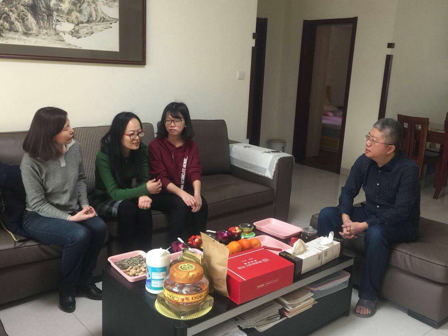 1�30日上午,经济学院党委书记吴红文、副书记任海伦,辅导员周新秀来到位于济南市市中区二环南路2014级学生李晓雅家中。李晓雅是我院优秀学生的代表,中共党员,曾获省级优秀毕业生、校长奖学金,多次获一等奖学金、校优秀学生干部、优秀学生、优秀团员等,曾任团支书。作为专业排名第一名和推免考试第一名的获得者,她收到了暨南大学硕士研究生推荐免试入学资格,却因母亲身体不好拒绝这一机会选择成为考研大军中的一员。领导老师们就李晓雅的生活、学习和考研情况与家长及学生进行了亲切交流,鼓励并支持学生继续深造,以扩展知识视野,提高学术水平,增强就业竞争力,并介绍了目前国内高校研究生的奖励办法、额度和科研激励政策�