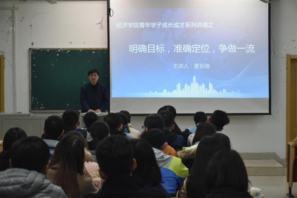 (通讯员:田永佳)10�31日晚18:30,为贯彻落实十九大会议精神,指导学生学业课程和发展规划,加强学风和班风建设,经济学院于圣井校区B5307举办 “明确目标,准确定位,争创一流”讲座。此讲座系我院青年学子成长成才系列讲座之一,经济学院院长董长瑞主讲�2016级全体学生干部到场参加�