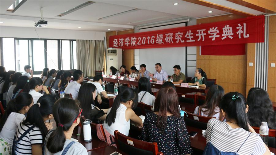 2016�9�5日上�9时,经济学院2016级研究生开学典礼暨入学教育大会于舜耕校区天舜大�600室隆重举行。经济学院院长董长瑞、党委书记吴红文、副院长王传荣、副书记任海伦、仵颖涛、团委书记周新秀�研究生及科研秘书张新春出席本次开学典礼�我院2016级全体研究生新生参加了本次大会。本次大会由任海伦主持�