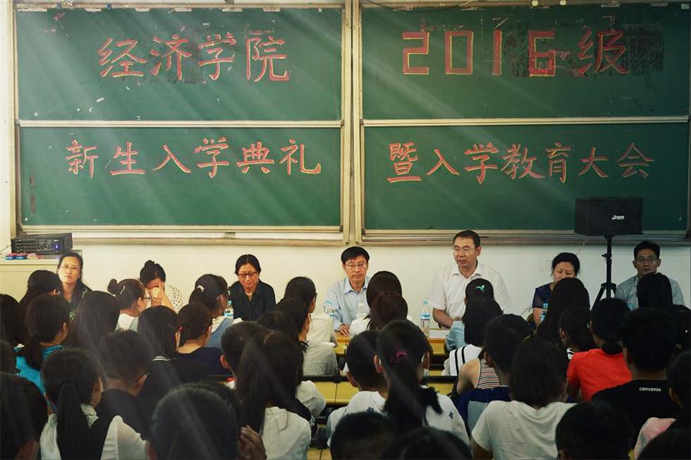 (通讯员:李雨桐、姜立阳�8�29日下�14:30,经济学�2016级新生开学典礼暨入学教育大会于圣井校区敏行楼B5-201教室隆重举行。经济学院院长董长瑞、党委书记吴红文、副院长王传荣、副书记任海伦、仵颖涛,教师代表于凤芹、院团委辅导员出席会议�2016级全体新生到场参加,会议由任海伦主持�
