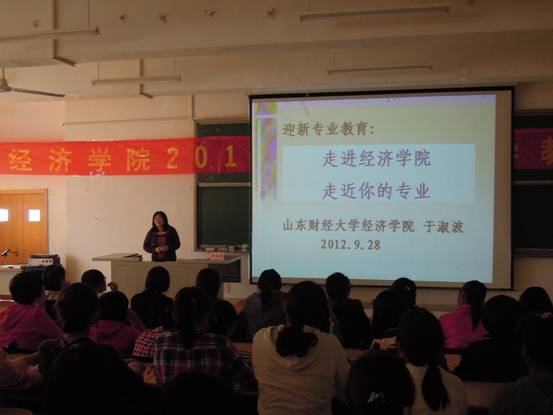 9�28日下午,我院在圣井校区敏行楼B5201室召开主题为“走进经济学院,走进你的专业”的迎新专业教育讲座。我院副院长于淑波教授为新生详细介绍我院及所设专业的情况。我院学工办主任兼团总支书记周新秀老师、就业办主任兼党总支秘书李冰封老师�2012级全体新生参加此次讲座�
