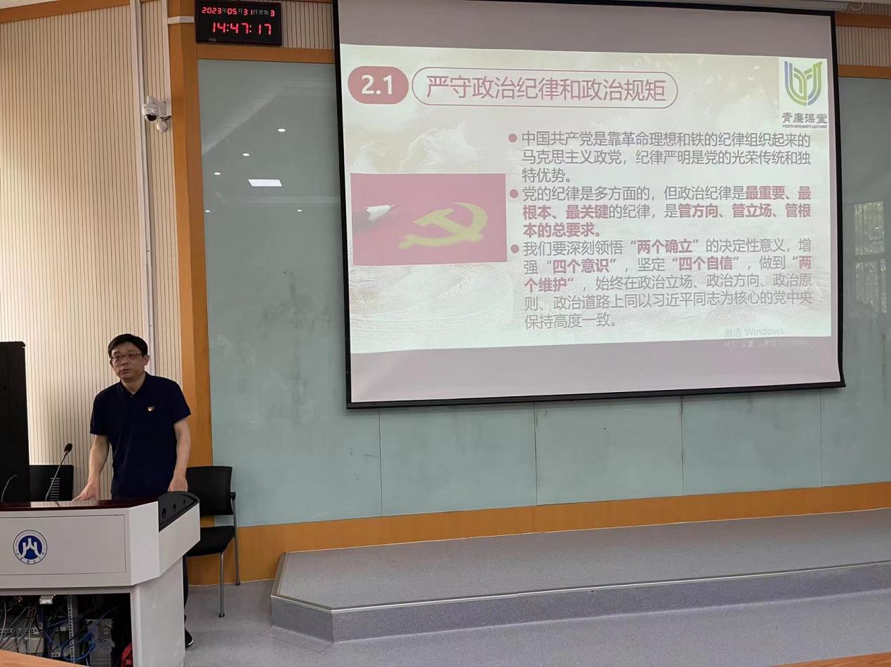 学院开展“青廉课堂”—�2023届毕业生党员廉政教育党课。学院党委书记姜伟以《锤炼党性,廉洁自律》为主题,深入阐释了全面从严治党的重大意义,并结合典型案例,深刻剖析了年轻干部违纪违法的特点和原因,警示同学要勤弹“思想尘”、多思“贪欲害”、常破“心中贼”、慎独慎微,知敬畏、存戒心、守底线,要树立正确的人生观、权力观和道德观,增强法律意识,坚定理想信念,牢记初心使命,扣好廉洁从业的“第一粒扣子”。他指出,“青廉课堂”是提高毕业生党员廉洁自律意识的重要举措,希望同学们坚定理想信念,坚定不移听党话,跟党走,筑牢廉洁从业思想道德防线,提高拒腐防变和自我保护能力�