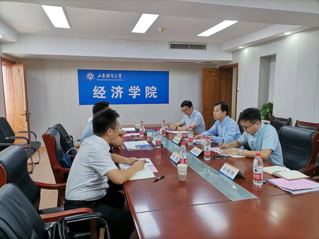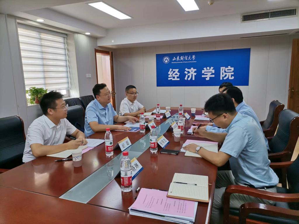 8�8日下午,山东省担保集团战略部部长、省担保协会秘书长张彧一行三人来我院座谈交流,副校长兼经济学院院长谢申祥出席并讲话,经济学院副院长张明志,数字经济学系副主任刘建旭及学院教师孙晓琳参加座谈�