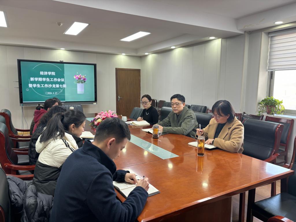 2�27日上午,经济学院召开新学期学生工作会议暨第七期学生工作沙龙,学院党委书记姜伟、党委副书记李冰封、陈静及全体辅导员参加会议,会议由党委副书记李冰封主持�