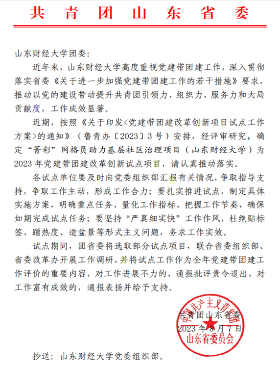 (通讯员:付雯 姜琛)近日,山东财经大学经济学院“菁彩”网格员助力基层社区治理项目获批共青团山东省�2023年党建带团建改革创新试点项目,共青团山东省委2023年度“百万大学生进社区”社会实践活动示范项目,姜琛同学获共青团山东省委2023年度“百万大学生进社区”社会实践活动先进个人�