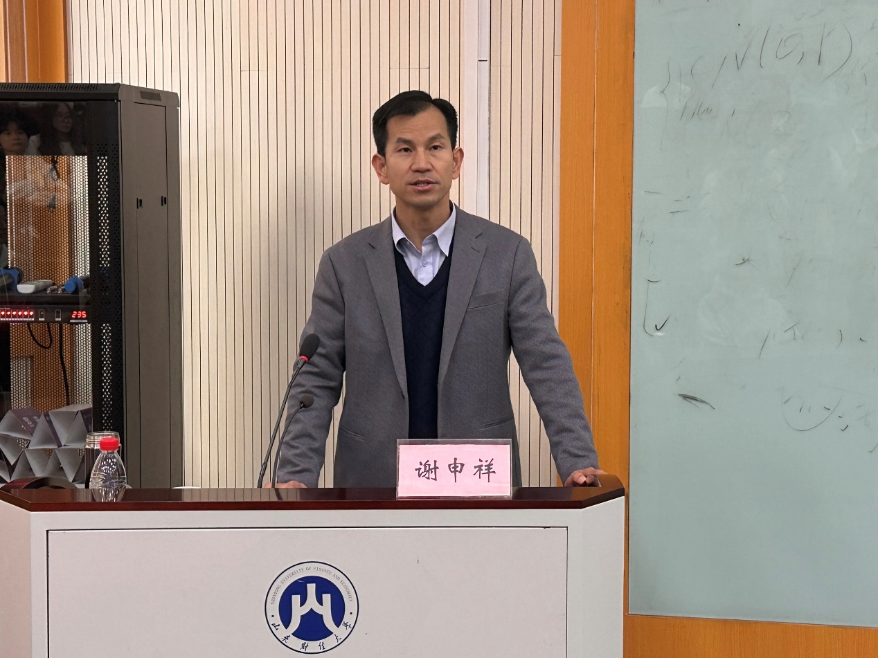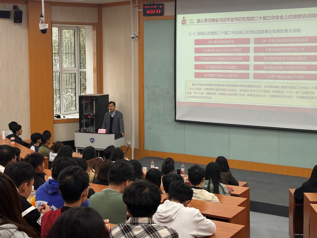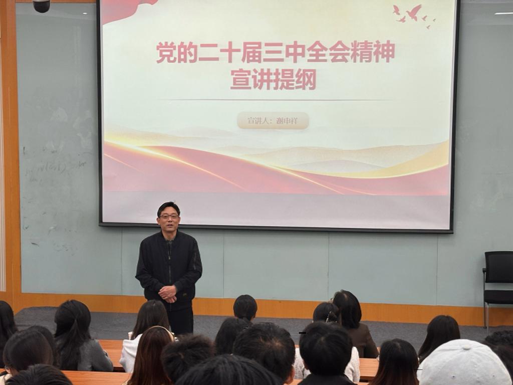 (通讯员:付雯 刘素清)10�29日,学校宣讲团成员、校党委副书记谢申祥到经济学院宣讲党的二十届三中全会精神。宣讲会在舜耕校区第三阶梯教室举行,经济学院党委书记姜伟主持�