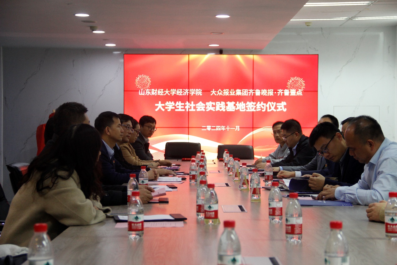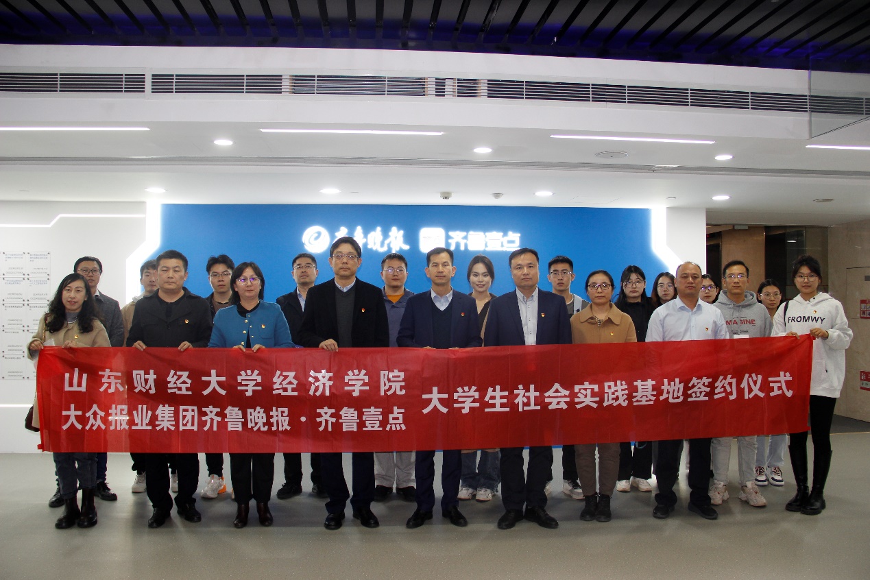 (通讯员:付雯 高强)为深入了解企业人才需求,拓宽学生就业渠道,为我校学生实践、实习和就业搭建供需对接平台�11�18日,校党委副书记、经济学院院长谢申祥带队赴大众报业集团齐鲁晚报·齐鲁壹点开展访企拓岗暨社会实践基地签约揭牌。经济学院党委书记姜伟,大众报业集团社委、齐鲁晚报·齐鲁壹点党总支书记、总经理、齐鲁壹点传媒董事长魏传强,副总编辑、副总经理李钢,副总编辑、技术总监宋耀,总经理助理、总编辑助理、办公室主任司君波出席活动�