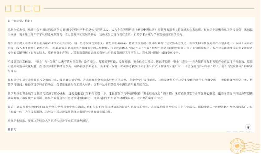 赵一恒在信中谈到,《解读中国经济》让他对中国经济发展逻辑有了更清晰的认知,也更加坚定了“以所学服务国家经济发展”的决心。同时,他结合美国因产业空心化引发贸易逆差扩大、底层民生困难等后果,以及国内部分地区劳动力成本上升、产业外流的现象,询问“中国未来是否会面临类似产业空心化风险”。信的最后,他代表班级全体同学表达了深耕新结构经济学的信念,并期盼林毅夫教授能够莅临学校进行指导交流�
