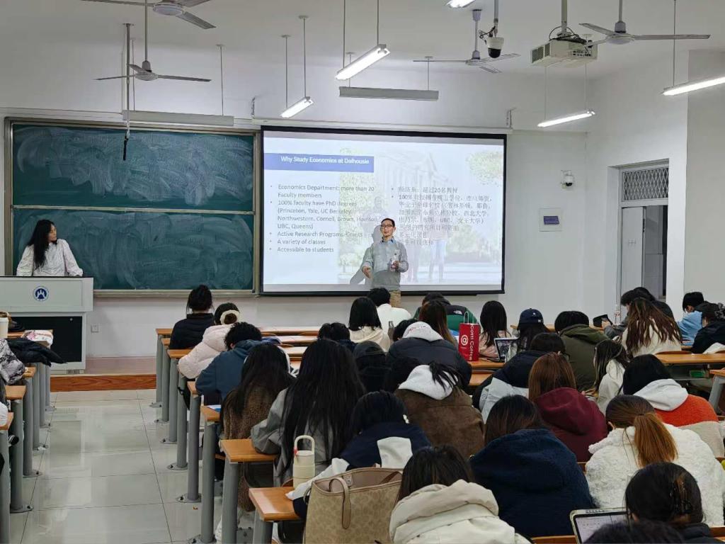 座谈结束后,Norovsambuu主任一行前往圣井校区,为经济学专业大二学生举办了题为“跨越大洋,数析未来”的中加合作项目分享会。会上,Norovsambuu主任详细介绍了达尔豪斯大学的学习环境、课程体系及未来发展前景,并就学生关心的留学申请、学分转捀就业方向等问题进行了耐心解答,激发了同学们的学习热情�