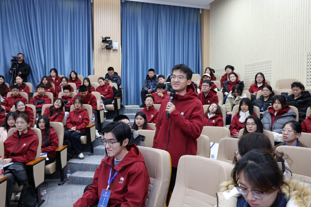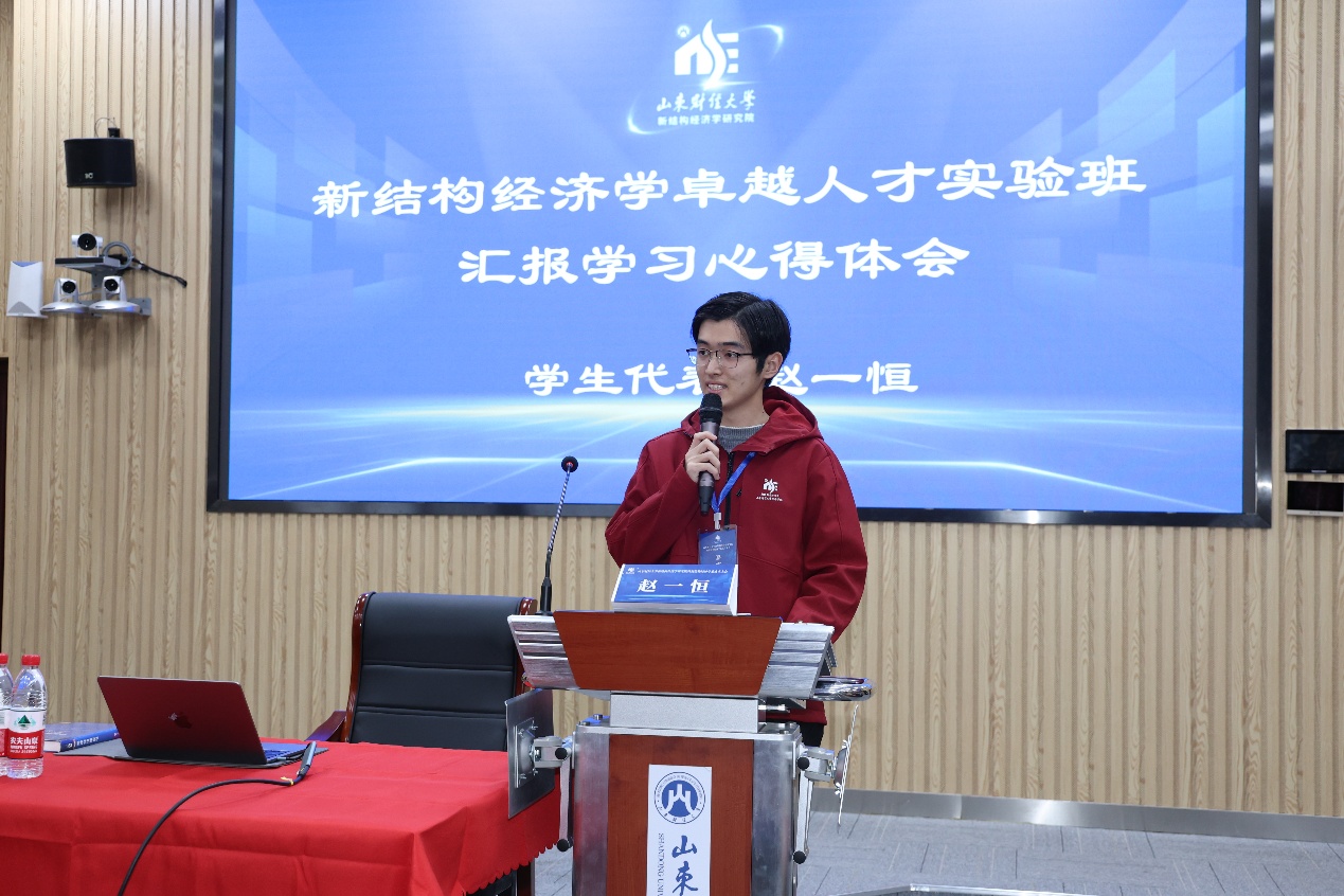 随后�2024级新结构经济学卓越人才实验班的赵一恒同学作为学生代表发言。赵一恒同学在汇报中回忆了自己与新结构经济学的不解之缘,分享了自己收到林毅夫教授回信时的激动和喜悦之情,并代表全班同学向林毅夫教授及各位领导老师做出承诺。他表示,作为新一代新结构经济学人,他们有勇气,也有信心,能够接过发展新结构经济学的接力棒,继续谱写这门学科的崭新篇章,为实现中华民族伟大复兴,构建人类命运共同体,贡献属于新结构经济学人的青春力量�