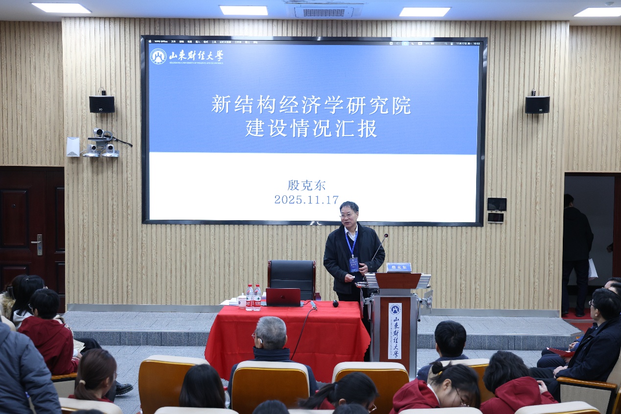 座谈会上,经济学院院长殷克东对新结构经济学研究院的建设情况进行了汇报,他从组织结构、办公场所、硬件设备、师资力量、课程体系、教研成果、学生活动以及与北京大学新结构经济学研究院的互动交流情况等多个方面向林毅夫教授进行了详细介绍,并表示将进一步支持新结构经济学研究院发展,强化新结构经济学卓越人才实验班的人才培养体系�