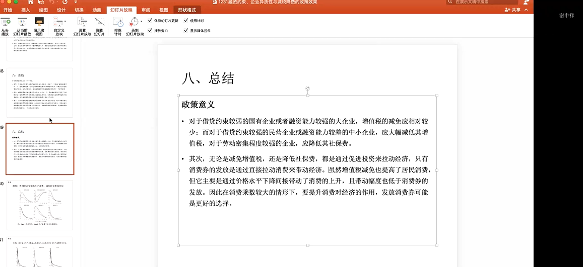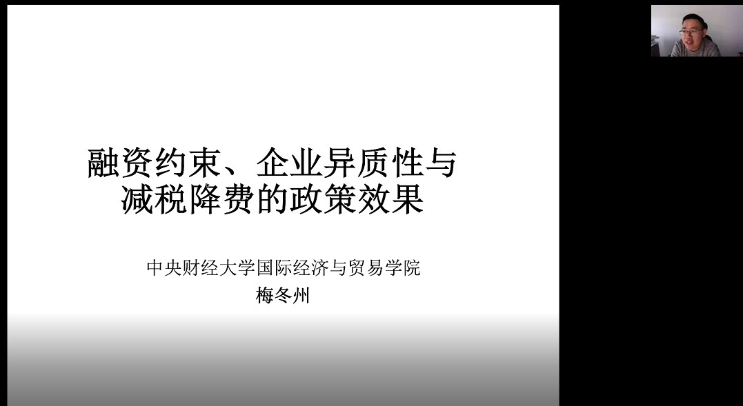 本次论坛的主题是“融资约束、企业异质性与减税降费的政策效果”,围绕这一主题,梅冬州教授从减税降费的背景、文献综述、模型、政策分析和总结几个方面展开论述,重点介绍了企业异质性和减税降费的核心概念。基于两个核心概念,梅冬州教授构建DSGE模型,通过参数的校对和估计,运用脉冲分析和政策分型来得出政府减费降税对企业的影响及作用效果。最后,梅冬州教授对减税降费提出了理论支持和政策建议。他建议用经济学的方法和视角来研究我国财政税收问题,既要研究一般的经济活动,同时也要研究财政税收活动�