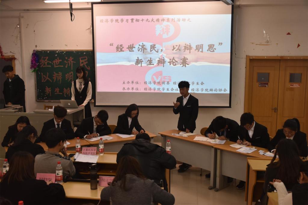 (通讯员:田永� 孙俏�)11�16日晚19�00,为学习贯彻十九大会议精神,营造学院良好学术文化氛围,培养学生逻辑思维能力和语言表达能力,经济学院于圣井校区敏行楼B5-307教室举行学习贯彻十九大精神系列活动之“经世济民,以辩明思”新生辩论赛决赛。各二级学院辩协负责人担任评委,我院决赛班级参辩选手和观众到场参加�