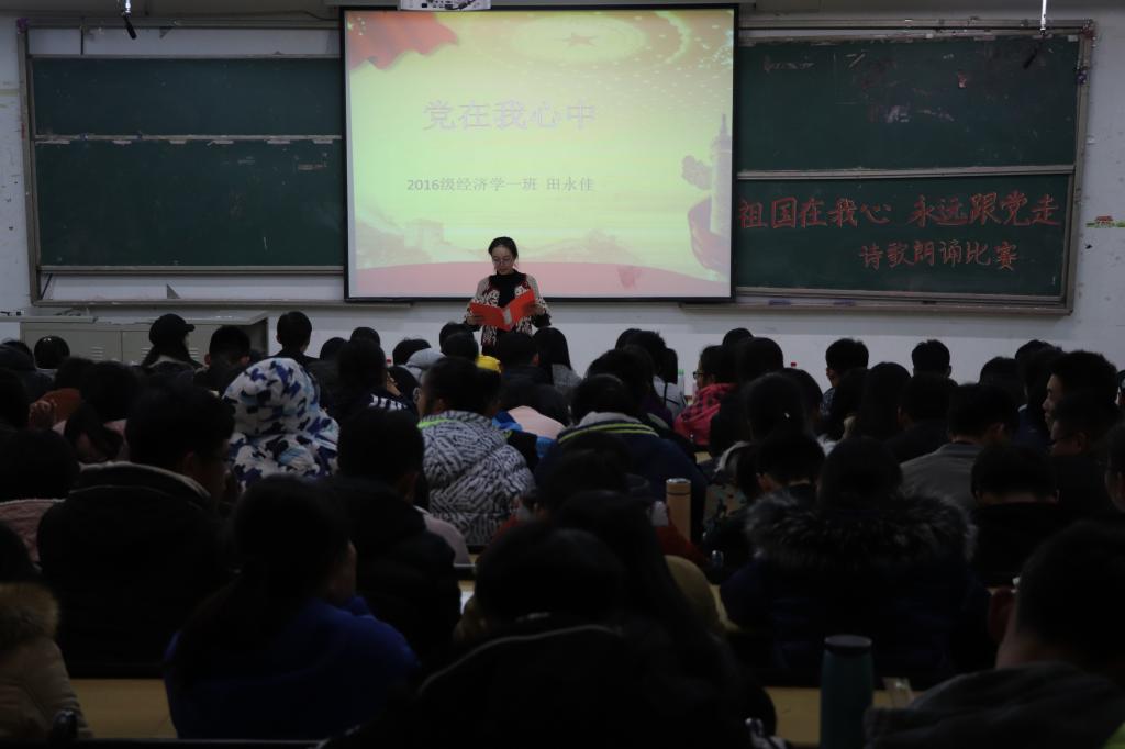(通讯员:杨晓� 常程)为深入学习贯彻十九大精神,弘扬爱国主义精神,激发同学们的爱国情怀,增强同学们建设新时代中国特色社会主义的责任感、使命感�11�14日晚�18�30,由经济学院团委、经济学院学生会主办,经济学院学生会社团部承办的我院学习贯彻十九大精神系列活动之“祖国在我心,永远跟党走”朗诵比赛于圣井校区敏行楼B5-201举行。校广播台负责人、经济学院学生会圣井校区副部长和17级全体同学到场观看�