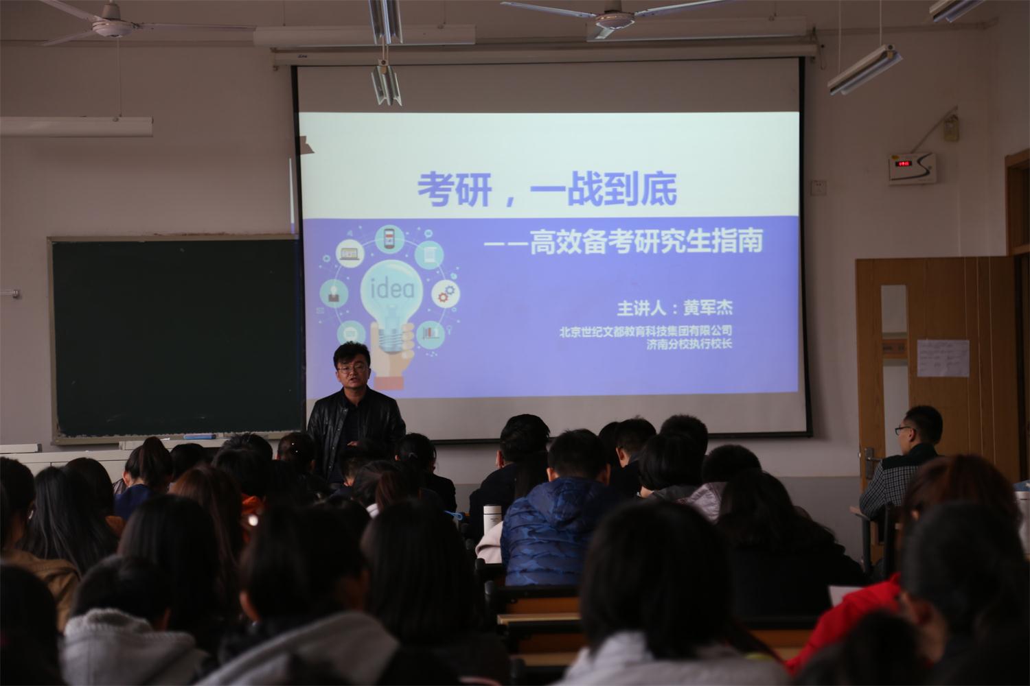 (通讯员:杨晶、刘如玉�1117日下�200,经济学院于舜耕校�1404教室举办“考研,一战到底——高效备考研究生指南”讲座,北京世纪文都教育科技集团有限公司济南分校执行校长黄军杰主讲,我院141516级部分同学参加,我院正科级辅导员付雯主持�