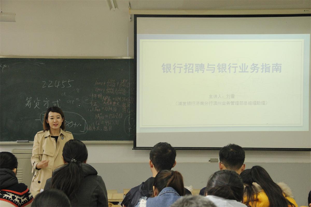 (通讯员:郭雯瑶)11�11日下�2�00,经济学院于舜耕校�1303教室举办“银行招聘与银行业务指南”讲座,浦发银行济南分行滨州业务管理部总经理助理刘蕾主讲,我院13�14级部分学生到场参加,讲座由院党委副书记任海伦主持�