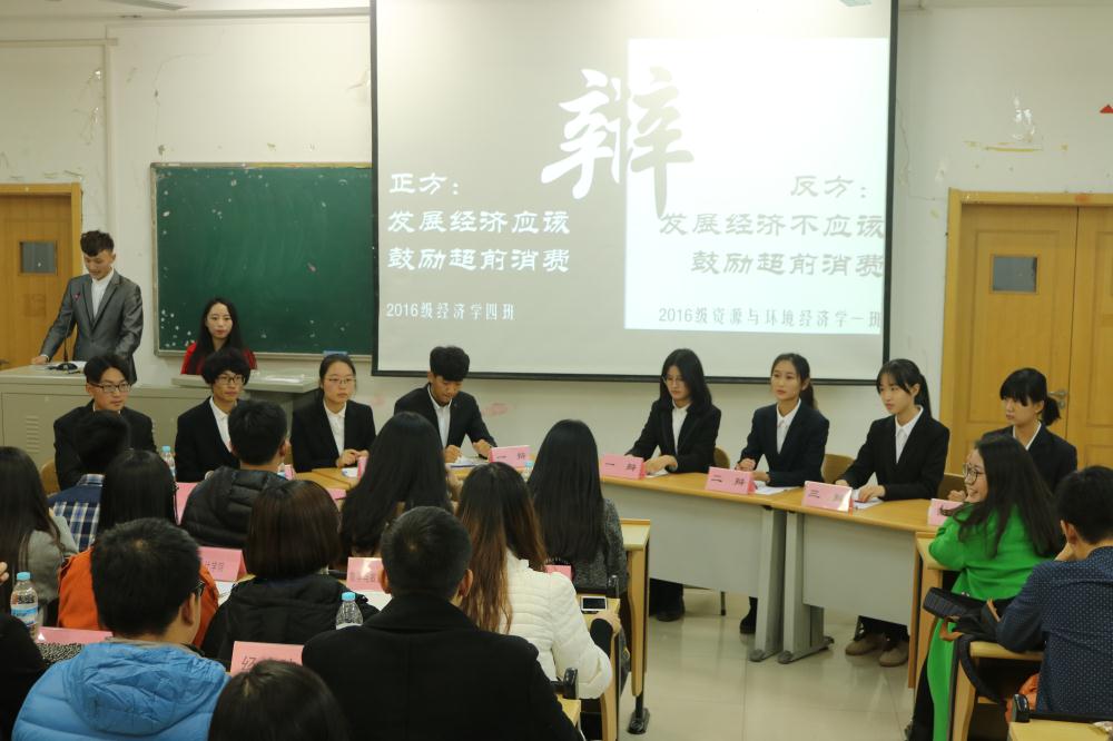 决赛双方围绕“发展经济是否应当鼓励超前消费”的辩题展开辩论。正方先声夺人,以“鼓励超前消费对发展经济具有促进作用”为论点展开理论陈述�从经济量的积累、经济质量的提高、经济结构的完善三方面着手,妙语连珠,势如破竹。反方思维缜密,机智应变,以“鼓励超前消费会给经济发展带来不可忽视的负面影响”为切入点,运用直接和间接两种方法,结合个人和社会两个层面,立稳阵脚,层层剖析。双方辩手唇枪舌剑,旁征博引,展开激烈交锋,赛场气氛紧张激烈。中场休息阶段,双方亲友团带来精彩的歌曲串烧和街舞表演,现场精彩不停,掌声不断。最�2016级经济学四班摘得桂冠,资源与环境经济学一班获得第二名;朱青、谢春旭�6名同学获得优秀辩手称号�