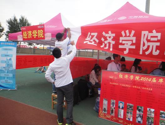 9�11号早�6点,我院学生会工作人员已早早来到圣井校区操场上,迎新的准备工作正在紧锣密鼓地进行。按照《经济学�2014级迎新工作方案》的要求,我院各工作人员恪尽职守,各负其责,通力合作,做好帐篷搭建、展板布置、物品运送、桌椅摆放、报到资料整理等工作,高效有序地保障了迎新工作的顺利启动�