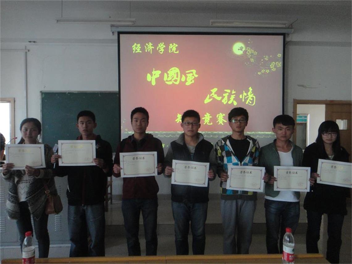 竞赛以班级为单位分成8个代表队,每�8人,其中参赛选手3人,亲友�5人。“限时问答”环节中,参赛选手认真审题,迅速组织答案,争分夺秒答题;“听词猜谜”、“看图识民族”环节中,选手根据关键词和大屏幕插图抢答竞猜,沉着冷静,思维缜密,从容应答;在才艺展示环节,各队亲友团为大家带来精彩纷呈的表演,洋溢着浓郁的民族风情,少数民族语言诗歌朗诵铿锵有力、掷地有声,歌曲演唱婉转悠扬、感情充沛,赢得在场同学们的热烈掌声。经过紧张激烈的角逐,13级农村区域与发展班获得一等奖,经济学一班、四班获得二等奖,资源与环境经济学班、经济学三班和二班代表队获得三等奖,经管一、二班代表队获得优秀奖�