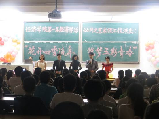 5�31日晚�7�00,经济学院在圣井校区敏行�B5201教室举办主题为“花开四季流年,筑梦五彩青春”的艺术团汇报演出。我�2012级各班同学到场观看�