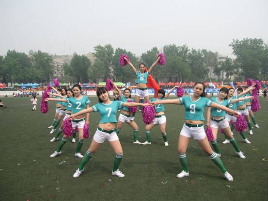 迎着和煦的春风,带着自信的微笑,我院啦啦操队员们伴着动感十足的节奏走上绿草坪,以充满爵士味的舞蹈为运动员加油助威。经过了十多天紧张刻苦的排练,啦啦操队员们以最曼妙的舞姿,最饱满的精神,最优雅的形象出现在运动会赛场上。她们扎着长长的马尾,身着孔雀绿的上衣和白色短裤,服装简练,队列整齐而富有变化,时而散开,时而聚拢,精确到位的伸展腾挪将运动的活力与美感展露无遗�