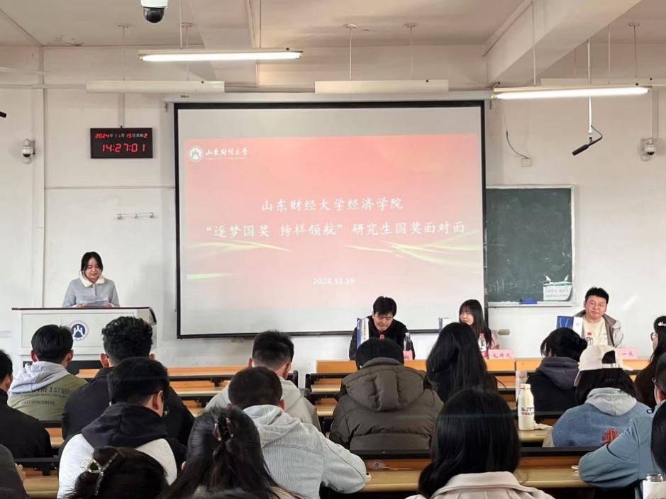 (通讯员:付雯 王璇�11�19日下午,经济学院在舜耕校�2号教学楼举办“逐梦国奖榜样领航”研究生国奖面对面活动。经济学院硕士生导师、应用经济系副主任刘传明出席活动。活动邀请了2022级产业经济学博士研究生王逸翔、区域经济学硕士研究生毛开元、西方经济学硕士研究生张一辰三位国奖获得者做经验分享�2024级全体研究生参加本次活动。活动由逯启萍主持�