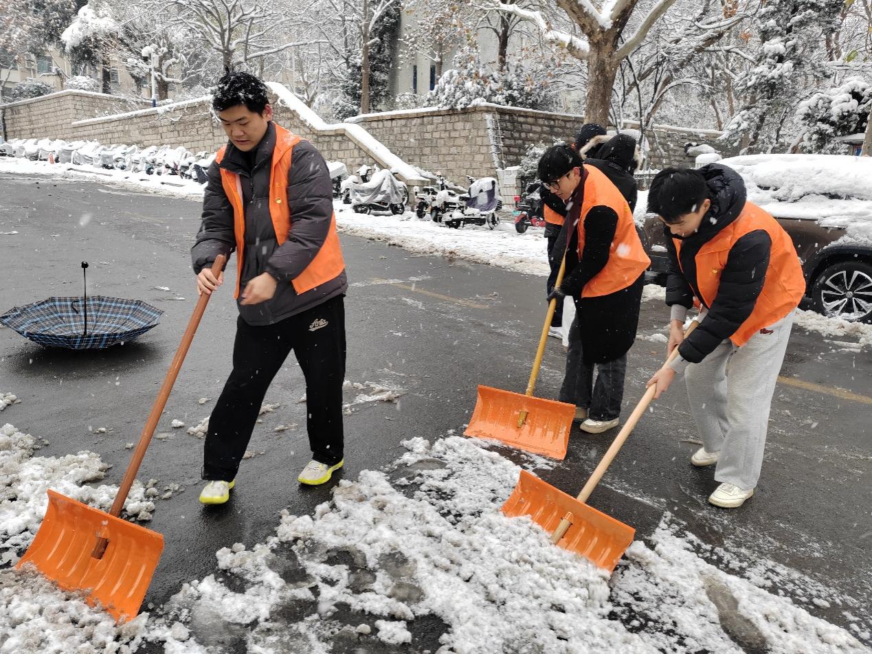 户外气温骤降,严寒丝毫未消弭全体成员的奉献热情,同学们主动响应、迅速行动,全力开展校园积雪清理劳动。大家手持各类清雪器具,齐心协力、并肩作战,对章丘校区七教西侧、九教北侧、七宿北侧、八宿北侧区域,舜耕校区行政楼广场前至西大门外区域的积雪进行彻底地清扫,全力消除出行安全隐患。清雪现场,同学们分工明确、协作无间,尽显团结奋进之风,以实干诠释校园情怀与责任担当�