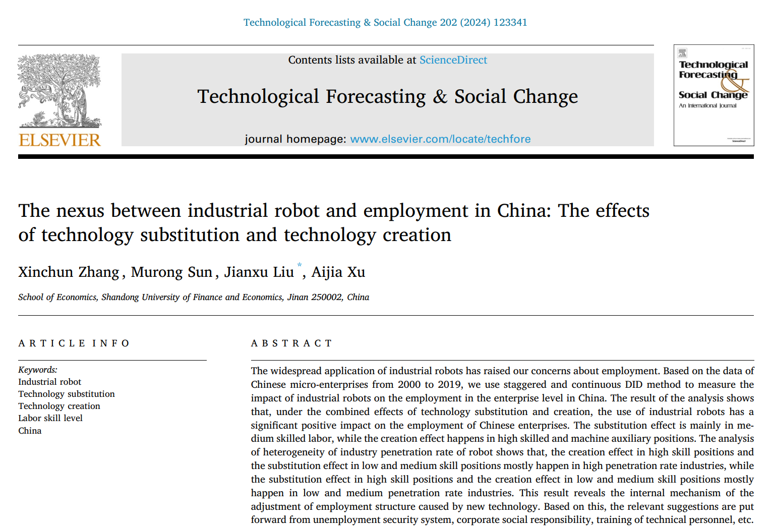 近日,我院张新春副教授与其指导的研究生及我院刘建旭副教授(通讯作者)合作的论文《The Nexus between Industrial Robot and Employment in China: The Effects of Technology Substitution and Technology Creation》,在创新管理领域Top期刊《Technological Forecasting and Social Change》正式在线发表。该刊是FMS科技政策类的高质量期刊,ABS三星期刊,中科院SCI一区TOP期刊。最新影响因�12,Cite Score17.2,系我校A1类期刊�
