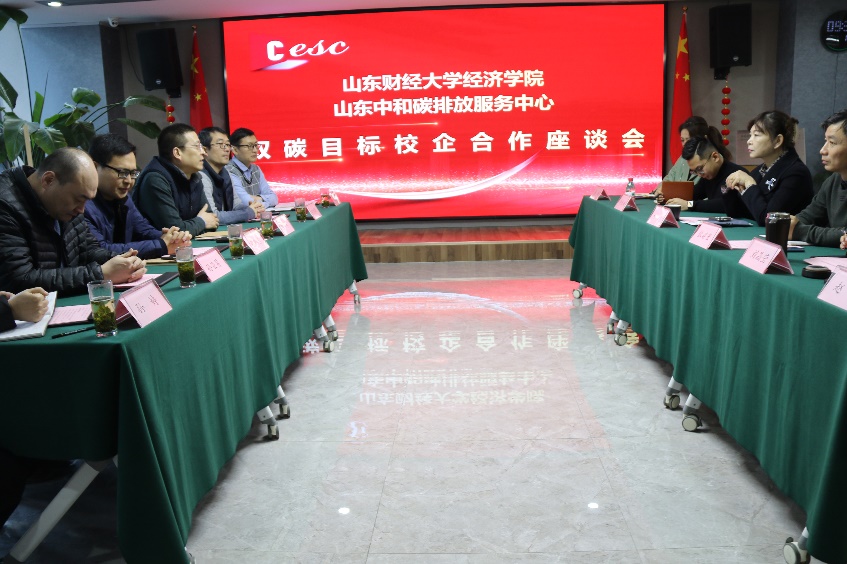 座谈会上,山东中和碳排放服务中心总经理郑静介绍了2023年中和碳服务中心的重点工作及发展战略规划,提出相关工作的人才需求情况;刘华军教授详细询问了中和碳服务中心相关工作进展,提出要抓住机遇,迅速响应,将学院教学育人和企业用人需求相结合,做实做细校企合作;张明志副院长介绍了学院双碳实验班的教学和培养情况,在共商人才需求、共建学科专业、共管人才培养等方面,提出了加强校企深度合作的方案;陈明华教授、孙亚男教授、赵传松副主任、孙婷副主任分别对校企合作中的资源共享、课程设置、碳交易模拟实操系统共建等多个方面进行了深入讨论与交流�