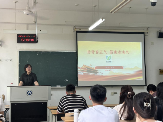 陈静以“扬青春正气,倡廉洁清风”为主题,从“扬信念之帆”、“存敬畏之念”、“怀感恩之心”三个章节为同学们进行了深入浅出的讲解,阐述了共产党人保持廉洁本色的崇高信仰和坚定意�,并结合具体案例进行剖析,引导同学们自觉学习党的纪律规�,敬畏法律法规,严守原则底线,时刻保持清醒和坚定�