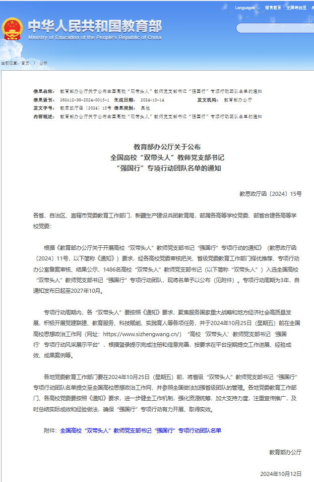 全国高校“双带头人”教师党支部书记“强国行”专项行动,是教育部党组为创新落实立德树人根本任务,深入推进教育、科技、人才“三位一体”协同融合发展,全面增强高校教师党支部的政治功能和组织功能,充分发挥基层党组织战斗堡垒作用和党员先锋模范作用而开展的专项行动,周期为三年�