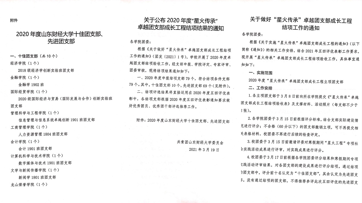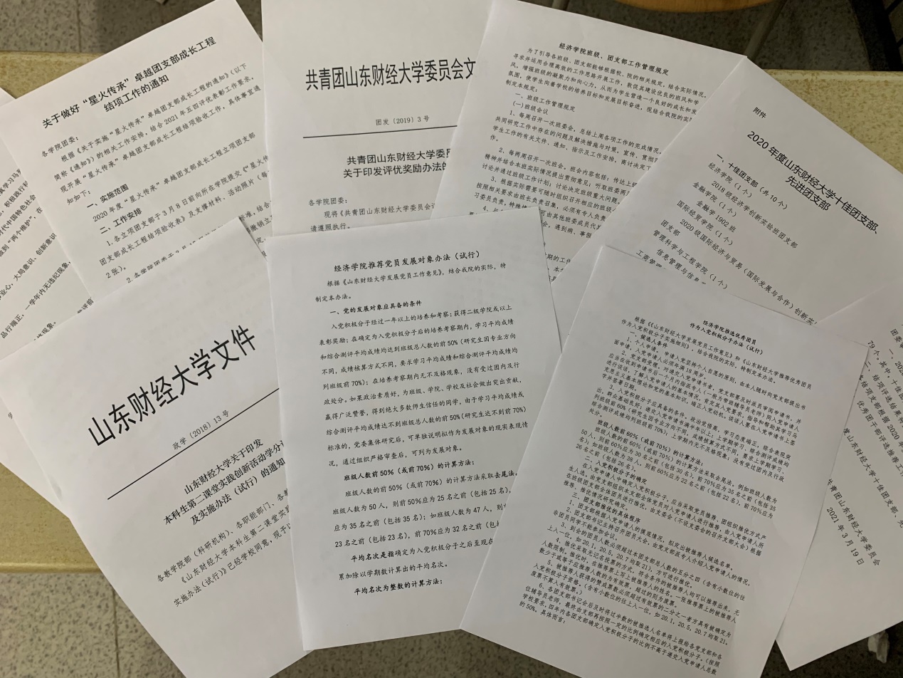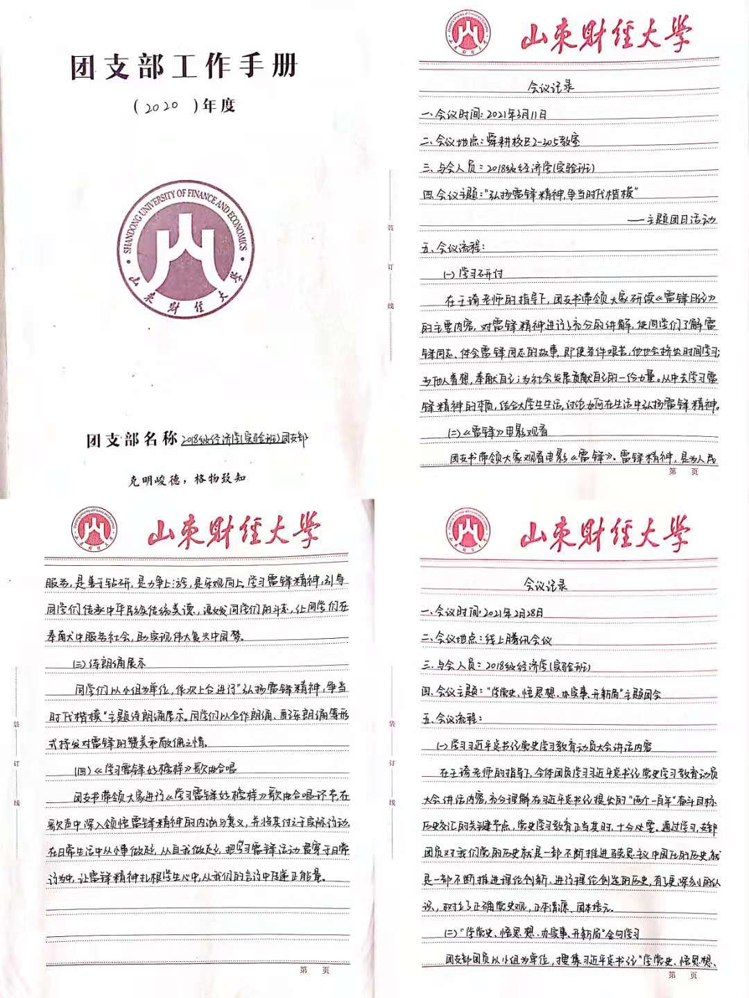 严格执行《中国共产主义青年团支部工作条例(试行)》、《共青团山东财经大学委员会评优奖励办法》、《山东财经大学关于印发本科生第二课堂实践创新活动学分认定及实施办法(试行)的通知》、《经济学院班委团支部换届选举办法》、《经济学院班级、团支部工作管理规定》、《经济学院推选优秀团员作为入党积极分子办法》、《经济学院党的发展对象的确定办法(试行)》等,落实“三会两制一课”制度,2020年召开7次团员大会�12次支委会�1次组织生活会�4次团课学习,提高团员思想理论水平和政治素质,引导团员在学习生活和本职岗位中发挥模范带头作用�