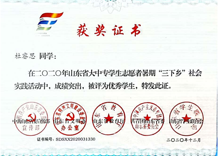 5人参加抗疫志愿服务,20余人参加“乡村振兴齐鲁样板研究”调研服务队校级重大项目�8人参加“打造美丽宜居乡村,村庄景区化公益行”校级重大项目,杜睿思获省级社会实践优秀学生,为助力脱贫攻坚、乡村振兴贡献力量�