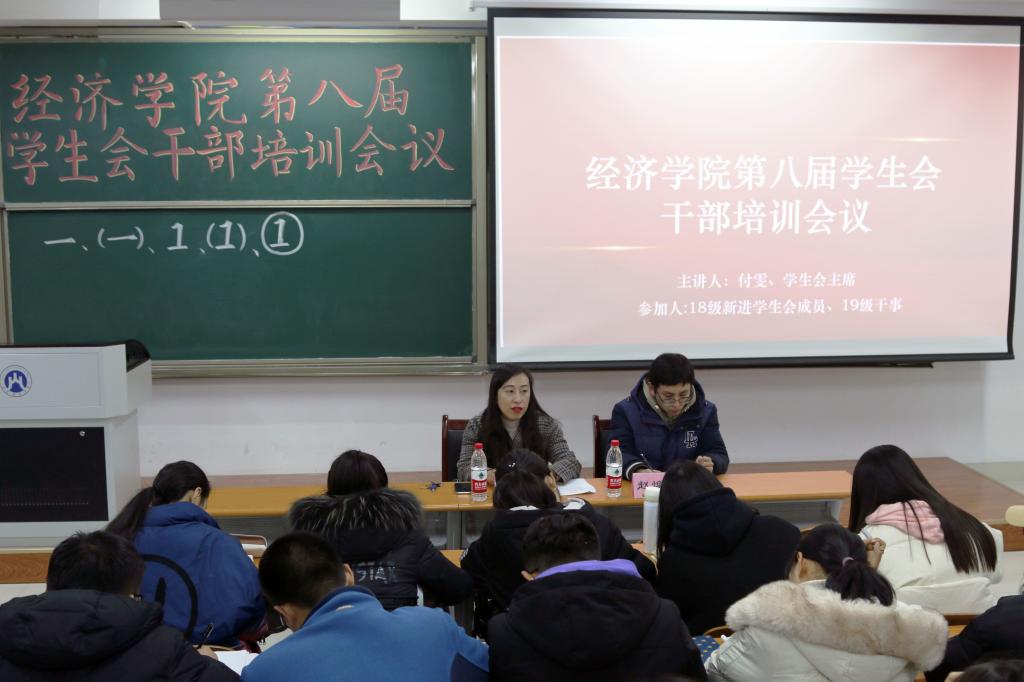 (通讯员:孙莹�12�9日晚�19:30,经济学院于圣井校区7号教学楼召开第八届学生会干部培训会议。培训会由院团委书记付雯主讲。我�2018级�2019级新加入的学生会成员参加培训�