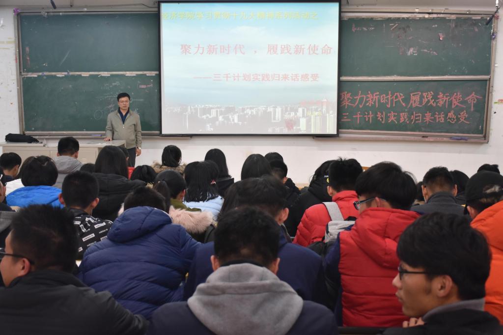 (通讯员:李雨� 田永�)11�4日至15日,为学习贯彻党的十九大会议精神,激发同学们深入基层、了解民生,参与社会实践的激情和热情,经济学院于舜耕、圣井校区举办“聚力新时代,履践新使命”三千计划实践归来话感受交流会。此活动系我院学习贯彻十九大精神系列活动之一,我院暑期社会实践优秀指导教师臧传琴、安丰东,部分优秀调研团队队长与同学分享实践经验和感悟�2017级全体同学到场参加�